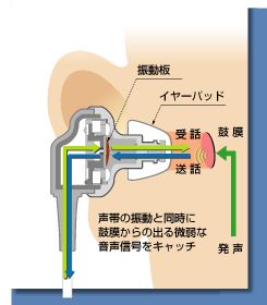 - 声を出すときに耳の中で発生する微弱な空気振動をとらえ、それを音声信号に変換して出力。だからマイクが不要。